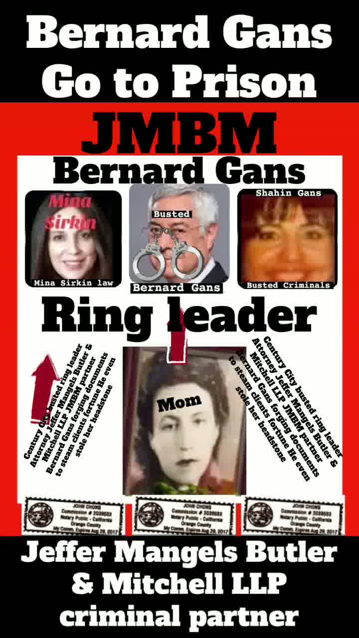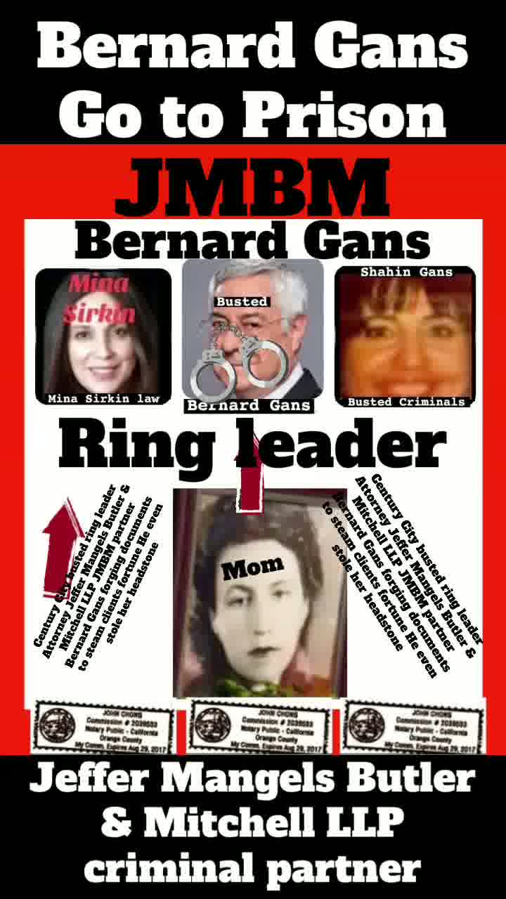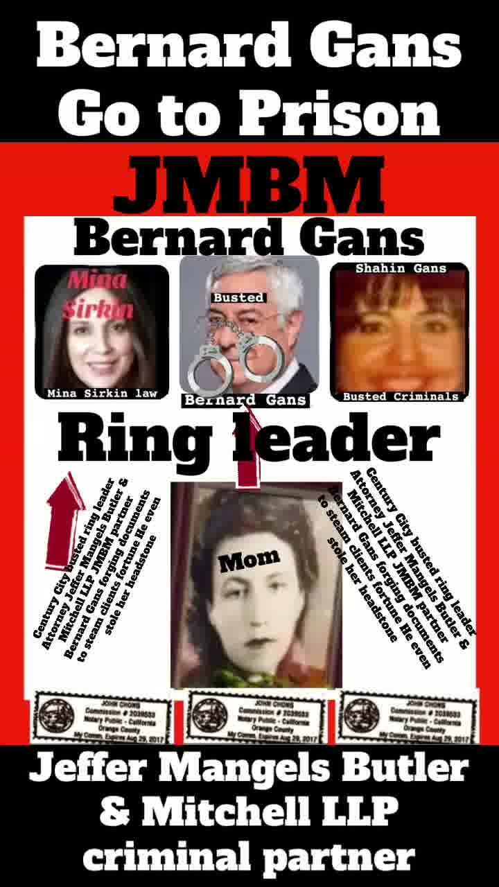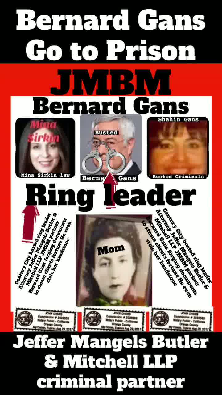 Suing JMBM partner $500,000,000,000.00 Busted criminal attorneys Jeffer Mangels Butler & Mitchell LLP lawyer Bernard Reginald Gans #57068 Bernard Gans Mina Sirkin law group JMBM killed my mom to get her fortune.Suing JMBM partner $500,000,000,000.00 Busted criminal attorneys Jeffer Mangels Butler & Mitchell LLP lawyer Bernard Reginald Gans #57068 Bernard Gans Mina Sirkin law group JMBM killed my mom to get her fortune..