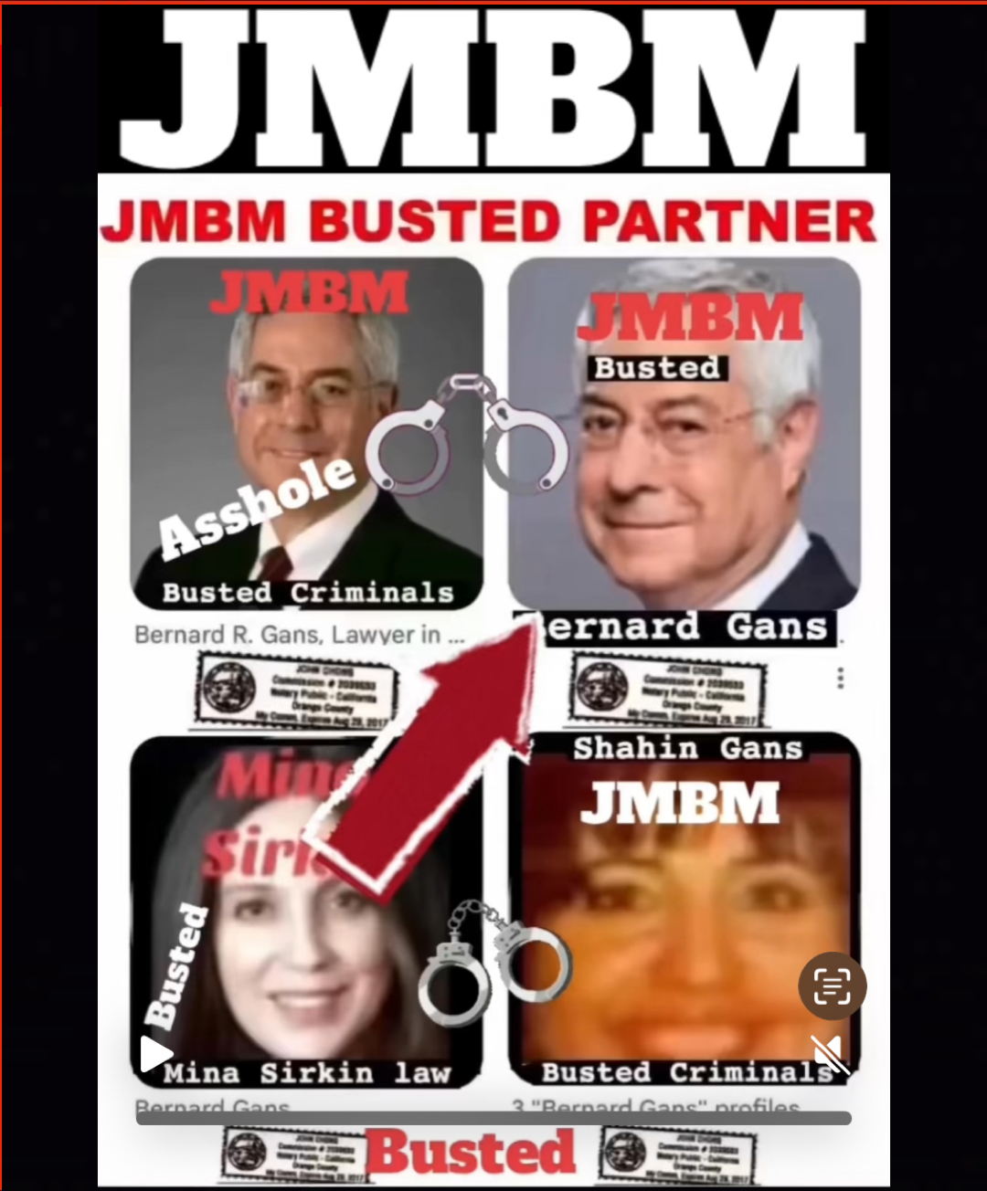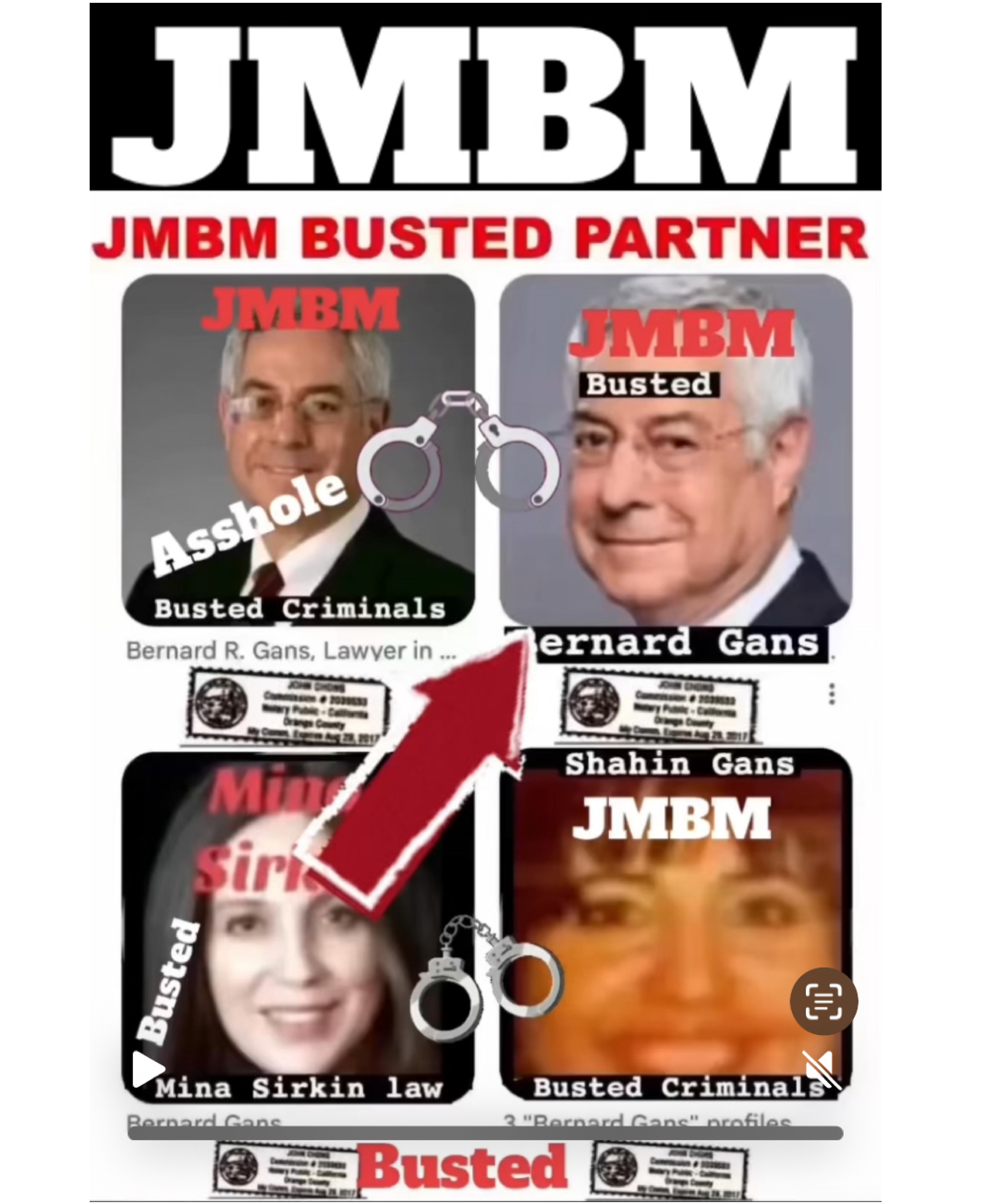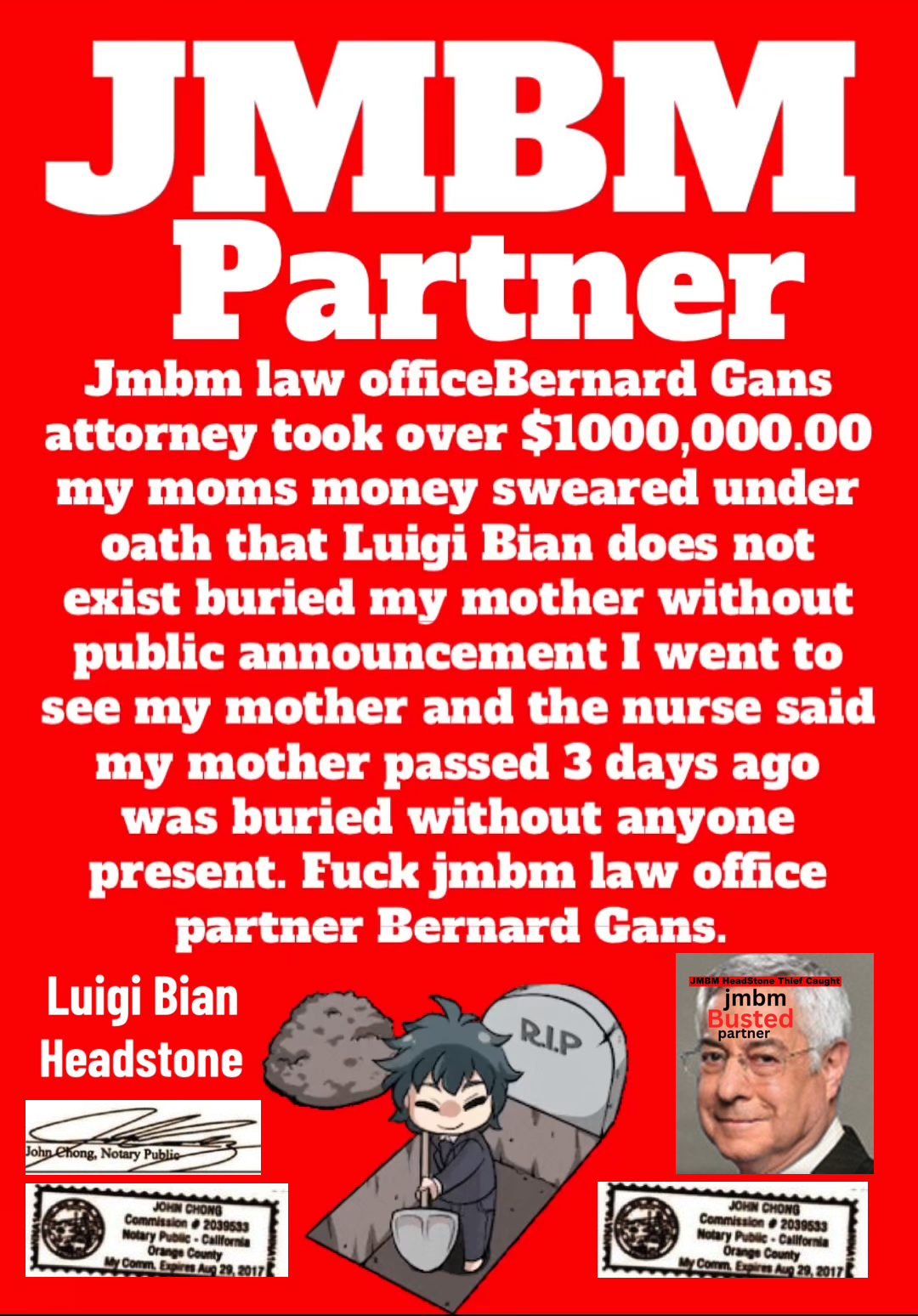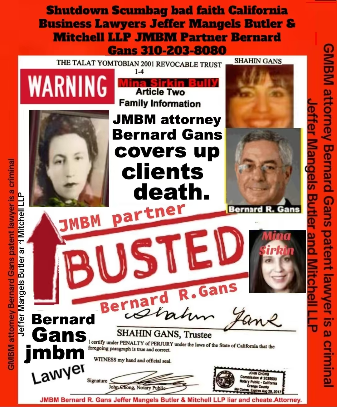 Suing JMBM partner $500,000,000,000.00 Busted criminal attorneys Jeffer Mangels Butler & Mitchell LLP lawyer Bernard Reginald Gans #57068 Bernard Gans Mina Sirkin law group JMBM killed my mom to get her fortune.Suing JMBM partner $500,000,000,000.00 Busted criminal attorneys Jeffer Mangels Butler & Mitchell LLP lawyer Bernard Reginald Gans #57068 Bernard Gans Mina Sirkin law group JMBM killed my mom to get her fortune.