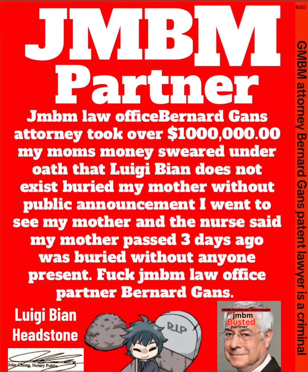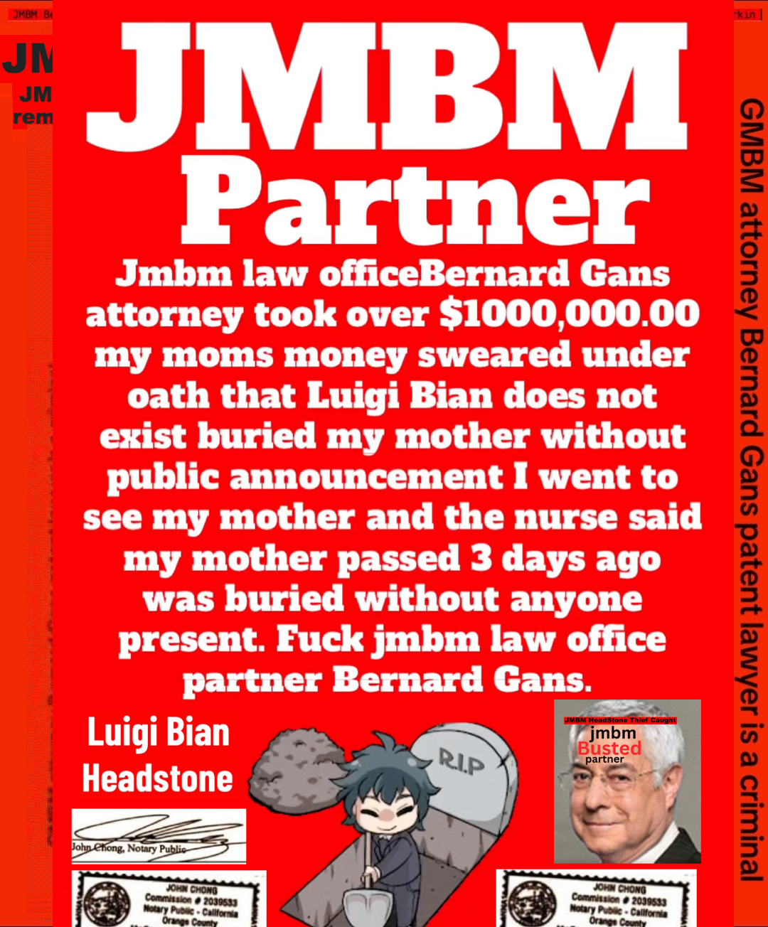 Suing JMBM partner $500,000,000,000.00 Busted criminal attorneys Jeffer Mangels Butler & Mitchell LLP lawyer Bernard Reginald Gans #57068 Bernard Gans Mina Sirkin law group JMBM killed my mom to get her fortune.Suing JMBM partner $500,000,000,000.00 Busted criminal attorneys Jeffer Mangels Butler & Mitchell LLP lawyer Bernard Reginald Gans #57068 Bernard Gans Mina Sirkin law group JMBM killed my mom to get her fortune.Suing JMBM partner $500,000,000,000.00 Busted criminal attorneys Jeffer Mangels Butler & Mitchell LLP lawyer Bernard Reginald Gans #57068 Bernard Gans Mina Sirkin law group JMBM killed my mom to get her fortune.
